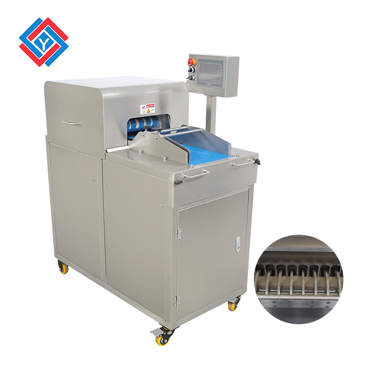 這款切肉丁機整體采用了不銹鋼制作,機身鋼板厚度達到了3mm,表面使用了拋光拉絲處理工藝,優(yōu)化衛生方便清洗,切肉丁機的刀片是不銹鋼材質(zhì),特別淬火加工過(guò)后,可用鋒利的刀片將鮮肉開(kāi)條再切塊,切割紅殺肉塊的肉丁迅速且大小均勻,機身同時(shí)還采用了快拆式刀組,方便更換加工其他肉類(lèi),省去了大量的人工成本。
